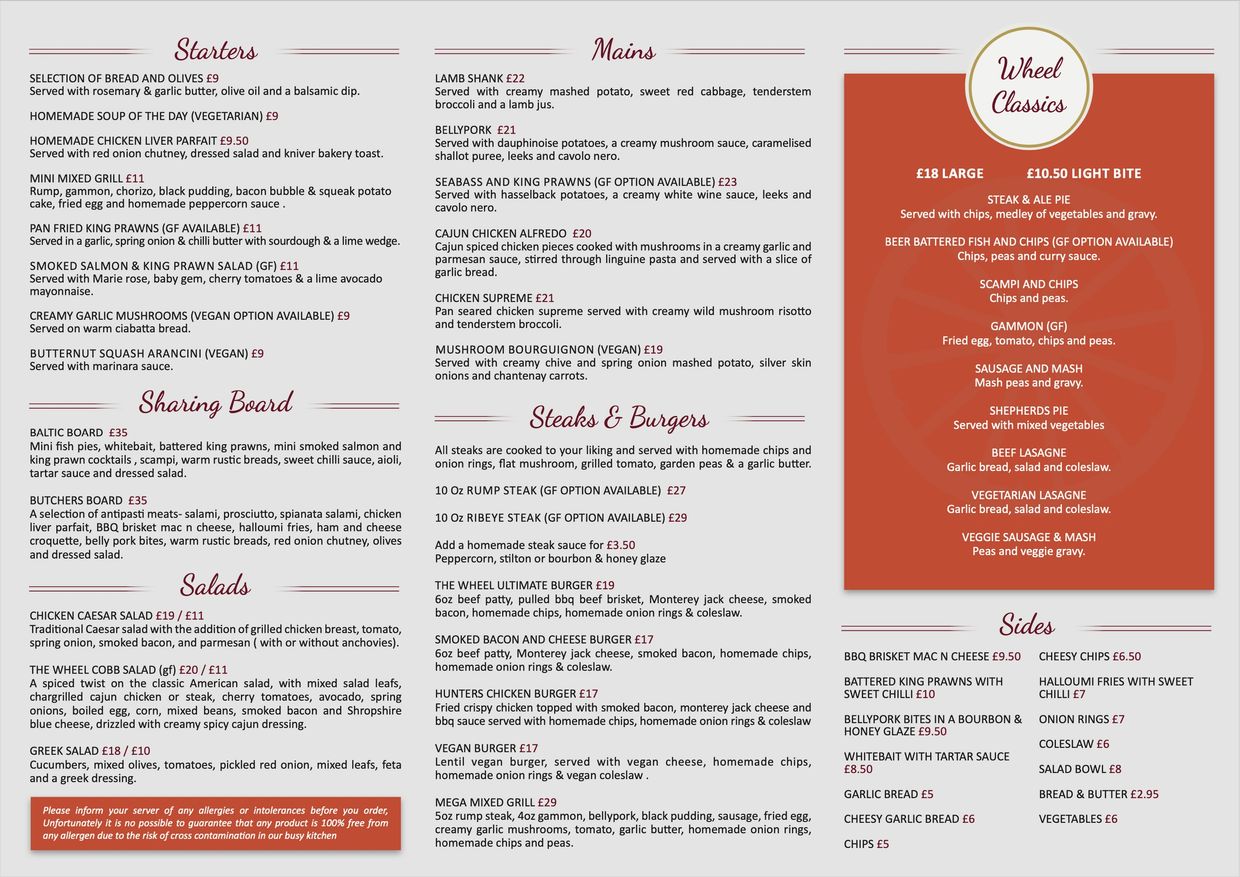 At THE WHEEL Bar and Grill, we pride ourselves on serving up delicious food and drinks in a fun and lively atmosphere. Our menu features a range of options, from classic pub fare like fish and chips to gourmet entrees like grilled salmon and filet mignon. We also offer a variety of craft beers, wines, and cocktails to complement your meal. Our friendly staff and cozy ambiance make THE WHEEL Bar and Grill the perfect spot for date night, a family dinner, or a night out with friends.